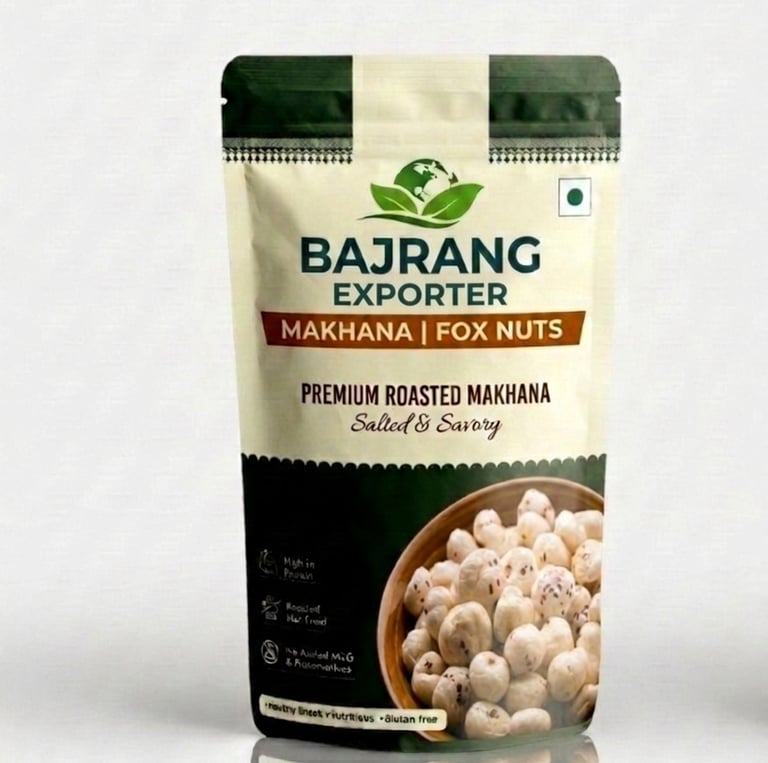 Makhana is first packed in properly sealed packets and then placed into strong master cartons to ensure safe handling and transportation.